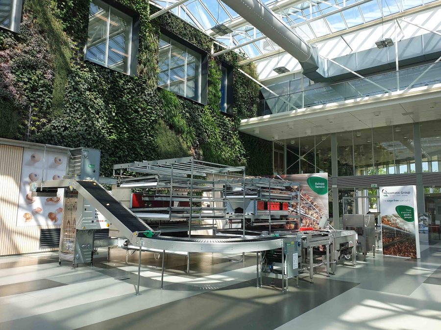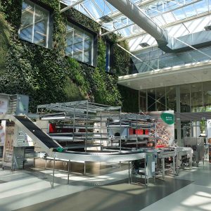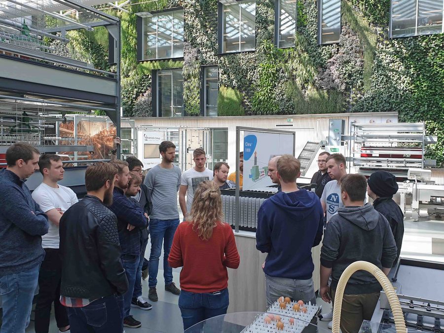 Tag 3: Auch der Besuch eines Automatisierungsbetriebes aus der Geflügelbranche des in der Nähe von Eindhoven liegenden Ortes Eersel weitete den Blickwinkel der Besucher für technische Innovationen und Nachhaltigkeit in diesem Tätigkeitsfeld. Das Produktionsgebäude – ein als so genanntes Null-Energie-Haus konzipiertes Gebäude – wirkte, nicht zuletzt wegen der besonderen Formgebung des Grundrisses (in Gestalt eines Vogeleis) sofort das Interesse unserer Fachschüler: Die gesamte zum Betrieb benötigte Energie wird aus regenerativen Quellen gewonnen. Zudem sind die gestalteten Arbeitsplätze hell und freundlich. Dieser erste Eindruck wurde noch verstärkt, denn in den Montagehallen befinden zahlreiche Grünpflanzen. Ferner hatten die hier Beschäftigten einen buchstäblich „eigenen Freiraum“, um ihre Ideen für die Verbesserung der Produktion auszuprobieren.