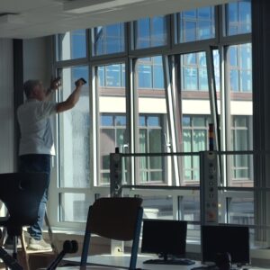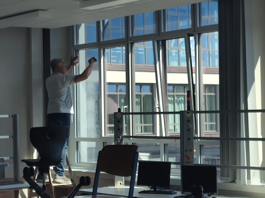 - Im 3. Stock erproben wir eine Folierung der Fenster mit Sonnenschutzfolie, um die Wärme im Raum zu reduzieren.