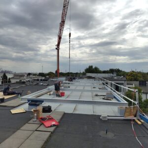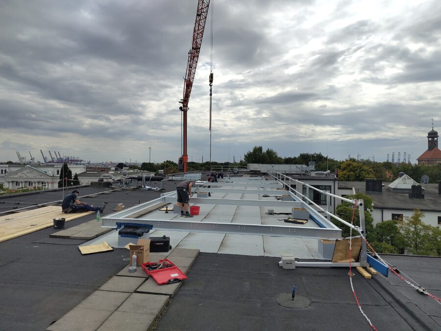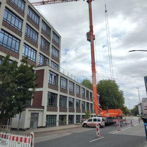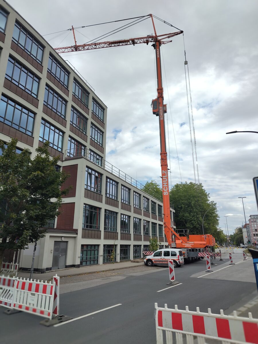- Und zudem hat endlich die Installation der lange geplanten Fotovoltaik-Anlagen und Kleinwindanlagen auf den Dächern der Schule begonnen. Diese Anlagen sind für den Unterricht gedacht und werden in den nächsten Wochen schrittweise fertig gestellt. Dazu wurde sogar die Straße gesperrt, um einen passenden Kran an der Schule zum Einsatz zu bringen.